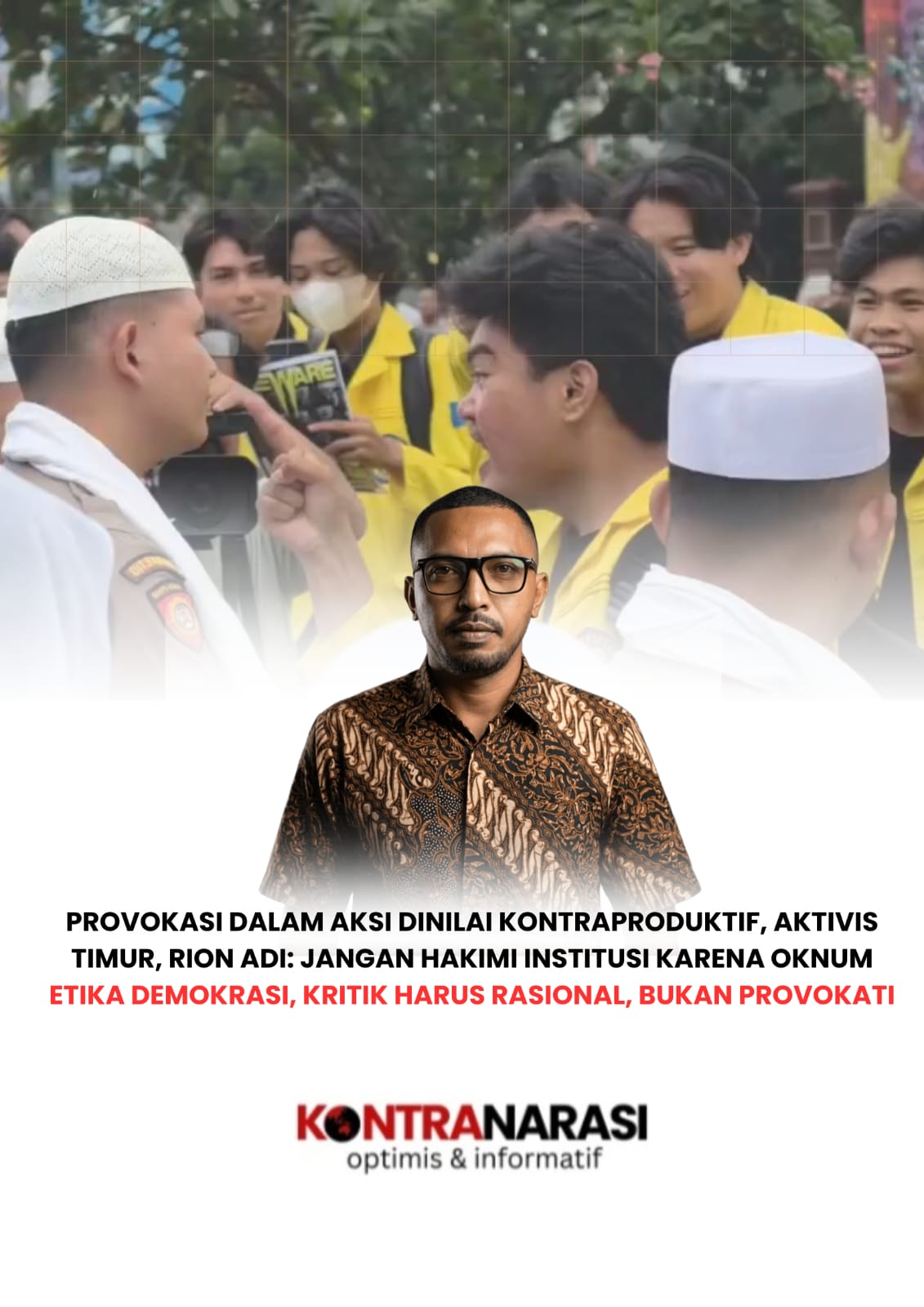 KONTRANARASI.COM – Salah satu Aktivis Indonesia Timur, Rion Adi menyampaikan keprihatinannya terhadap dinamika aksi demonstrasi mahasiswa yang belakangan dinilai keluar dari koridor etika intelektual. Ia menyesalkan adanya tindakan maki-maki terhadap aparat kepolisian serta penggunaan simbol atau tulisan bernada tudingan yang berpotensi memperkeruh situasi di lapangan.